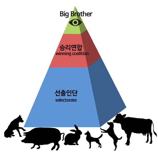 독재자는 돈의 흐름을 움켜쥐고 이 소수의 "승리연합"을 구성하여 그들의 지지를 기반으로 권력을 영구화하는데, 그 소수 중에 불순분자나 토사구팽 할 인물들을 끊임없는 의심으로 걸러내며, 언제든지 대체할 수 있도록 그 밑에 "실질 선출인단"을 최대한 많이 확보한다. 클렙토크라시(도둑정치) 기반의 이런 피라미드만 완비된다면, 하층민의 불평불만이나 전쟁, 정책의 실패 따위는 전혀 문제가 되지 않음을 책에서는 알려주고 있다.
