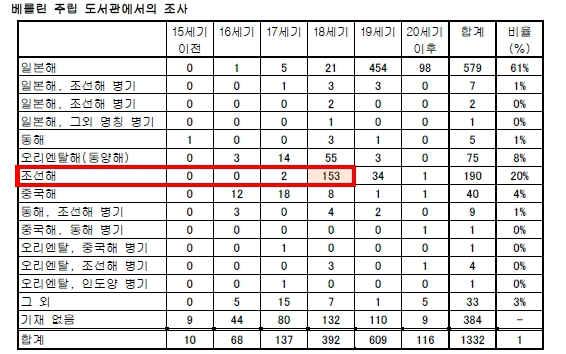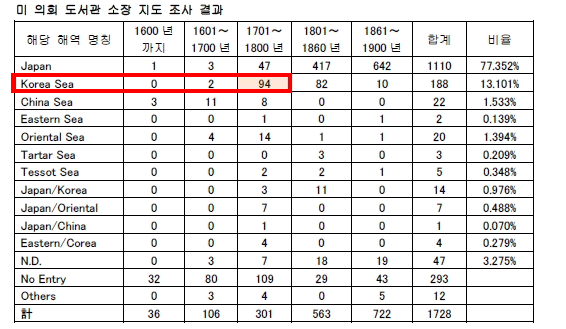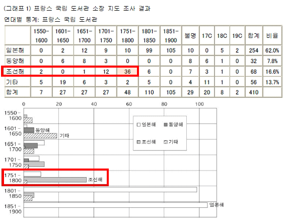 다음은 일본 외무성이 조사한 프랑스 국립도서관 소장 지도, 미 의회 도서관 소장 지도, 독일 소장 지도에서의 명칭 조사 결과이다. 한국해(Sea of Korea, 조선해)는 18세기까지만 해도 대세였으나, 조선 국운이 쇠퇴하고 19세기 일본의 개방과 제국화로 일본해가 세계적으로 알려져서 고착화된 것이다. 동해는 사실상 거의 없다시피 하다.