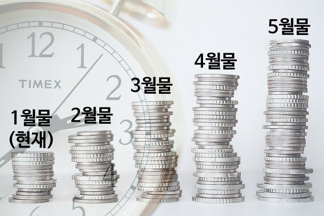 이렇게 다음 달, 다다음달의 선물 가격이 현재보다 높은 상황이 일반적이다. 이것을 콘탱고라고 한다. 그 반대는 백워데이션 이라고 하는데 흔하지 않은 상황이다.
