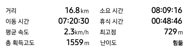 휴식시간이 포함되긴 했지만 넉넉히 평균속도 2km를 잡고 시작 전에 계산한 8시간이 진짜가 될 줄이야...