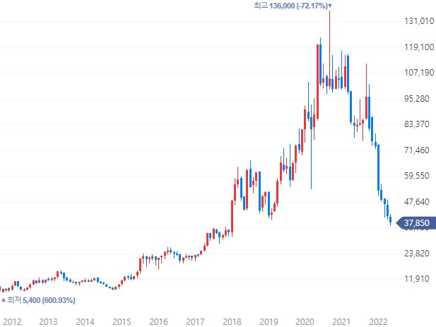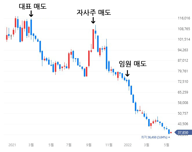 2020년 주식시장 호황으로 역사적 고점을 형성한 후에 2021년 3월 대표이사는 글로벌 사모펀드 베인캐피탈에 보유주식 4.77%를 주당 11만원에 블록딜로 넘겼다. 동사에서는 해외진출을 위한 포석으로 외국 자본의 투자를 받았다는 식으로 설명했지만 시장에서는 대주주의 고점 매도로 정확하게 받아들여 순식간에 8만원대로 조정을 받았다.