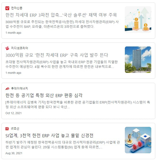 또한 더존비즈온의 가장 기대감이 큰 모멘텀은 한국전력 ERP 교체였다. 자회사 사용권 관련한 소송까지 진행한 SAP와의 불편한 관계와 공기업 S/W 국산화 여론에 맞물려 동사의 3,000억원대의 대박 수주 기대감은 수년동안 이어져왔다. 관련법에 따라 공기업 소프트웨어 입찰 시 대기업이 참여할 수 없다는 것과 공기업 수주 실적을 확대하고 있고 국내 1위로 검증된 토종기업이라는 점이 기대감을 절정에 다다르게 했다.