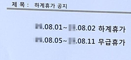 내가 다니던 곳은 갑자기 여름휴가로 2주 가까이 쉬라면서 4일 빼고 나머지 무급으로 처리한다고 통보했다. 무급휴가는 법적으로 평균임금의 70%를 지급해야 되는데, 그게 아니라 완전 무급, 자발적 결근하라는 말이었다. 가장 황당했던 건 놀러 가니까 또 전화와서는 할 일 많다며 나오란다.