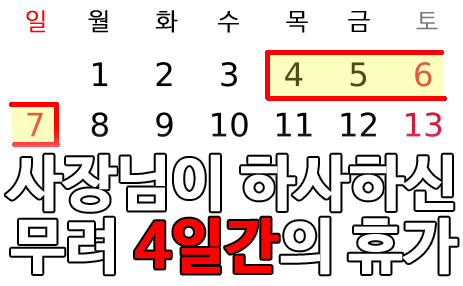 아니, 주말 포함이다. [토-일-월-화] 또는 [목-금-토-일] 주면서 4일이라 생색내며, 있는지도 모르는 연차를 서류상에서 처리한 후, 주말 빼면 실제로는 2일간의 감지덕지한 휴가를 제공하는 것이다.